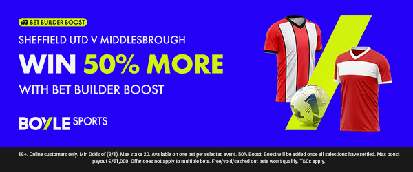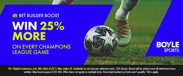 Boylesports Bet £10 Get £40 in Free Bets18+. New UK customers (Excluding NI) only. Min Deposit £10. Min stake £10. Min odds Evs. Free bet applied on 1st settlement of any qualifying bet. 30 days to qualify. Free bets expire in 7 days. Cashed out/Free Bets won’t apply. Account & Payment method restrictions apply. 1 Free Bet offer per customer, household & IP Address only. 18+. T&Cs apply.