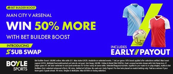 Bet £10 Get £40 in Free BetsSUB SWAP, LIVE NFL STREAM, SMART ACCA, 25-50% WIN BONUS, 2 GOALS AHEAD, CASH-OUT18+. New UK customers (Excluding NI) only. Min Deposit £10. Min stake £10. Min odds Evs. Free bet applied on 1st settlement of any qualifying bet. 30 days to qualify. Free bets expire in 7 days. Cashed out/Free Bets won’t apply. Account & Payment method restrictions apply. 1 Free Bet offer per customer, household & IP Address only. 18+. T&Cs apply.